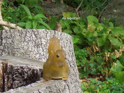 A sound had puzzled us for days...not only was it a high-pitched whirl that was loud for small, backyard nature, but we couldn't figure out where it was coming from...Chip is known to scurry around the back patio, under the deck and in between the planters, but this trill was high up...yet not avian...I couldn't see anyone on the roof, so it was someone small enough to hide in plain sight...I wondered if a chipmunk was capable of 'throwing' his voice like a ventriloquist?...I settled on that thin hypothesis only because I needed a reason to quell my curiosity. One noonday I lunched at my bistro and in my daydream, the answer caught my eye! There was a mottled gray lump wedged between the deck post and the house...it had a inflated throat which I later Googled to find was a vocal sac that acts like the hollow wood on a guitar amplifying the sound of the strings, or the sound of an echo in a large cave, projecting it across long distances! It's satisfying to solve a mystery...
